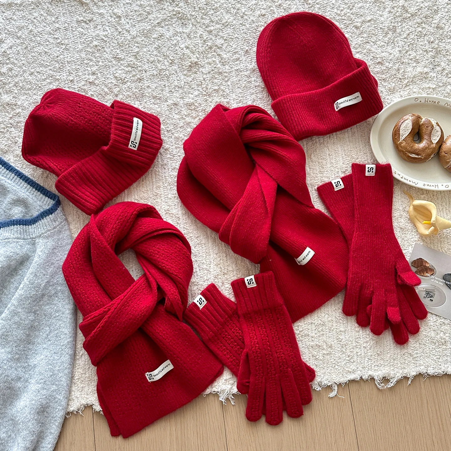 ♡Быстрый просмотрЗимняя теплая вязаная шапка, шарф, перчатки, женские ветрозащитные комплекты из трех предметов для взрослых, шарфы, однотонные модные корейские шапки для женщин1477.08 RUBГорячее★★★★★★4.7