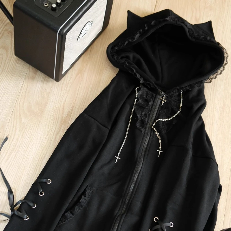 ♡Быстрый просмотрЧерная готическая толстовка с капюшоном, женская одежда, буквенный череп, вышивка на молнии, пальто Y2k, модная куртка с капюшоном, японские толстовки, топы Y2K2360.78 RUBГорячее★★★★★★4.5