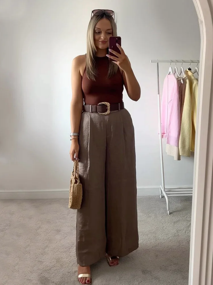 ♡Быстрый просмотрLinad элегантные коричневые атласные широкие брюки женские осенние модные бежевые брюки с высокой талией уличные шикарные шелковые длинные брюки женские 20251490.12 RUBГорячее★★★★★★4.5