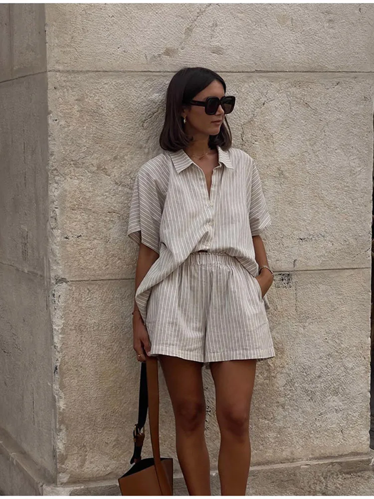 ♡Быстрый просмотрПовседневный полосатый свободный комплект шорт, женский шикарный однобортный рубашка с коротким рукавом и v-образным вырезом, костюм из двух предметов, летняя уличная одежда824.87 RUBГорячее★★★★★★4.7